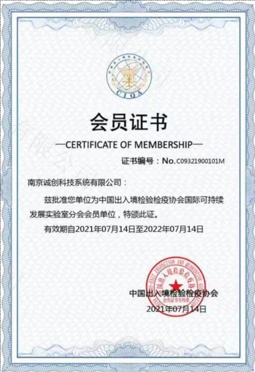 中国出入境检验检疫协会可持续发展实验室分会会员证书
